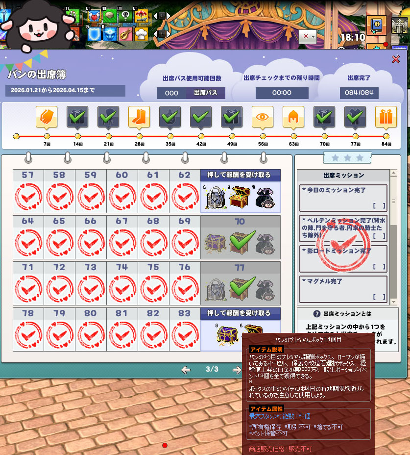 ローワンの衣装フルセット 84日目のイーゼルの受け取りに注意 2026年04月14日 12:13 カテゴリ:マビノギ装備 Tweet 出席パスを使わなければ1日も休むことのできないパンの出席簿。つまり1日の出席は30ポンあるいは50万ゴールドの価値があるということです。報酬の受け取りに際してはインベントリの空きに十分注意を払ってください。イベント期間終了後は報酬を受け取れなくなると注意事項がありますが、 過去の不具合まみれの出席簿イベントでは、受け取っていない報酬は「ポイントインベントリ」に支給されました。 衣装系と異なり、イーゼルの入っている報酬アイテムだけは有効期限があることに注意してください。以前のイベントでは危うく腐らせるところでした…ただのログインボーナス的なイベントなのに、いろいろ注意事項に留意しなければならない点を押さえておいてください。衣装には男女の区別があります。性別にやさしくないのがマビノギの伝統芸。……これを見れば男女の区別など不要ということがわかります。 続きを読む タグ :#イベント#仕様#報酬#アイテム#頭装備#衣装#手装備#足装備#浪漫農場#建造物
