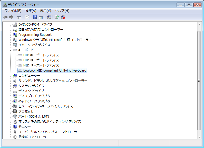 デバイス マネージャーでLogicool HID-compliant Unifying keyboardを詳しく調べてみる。