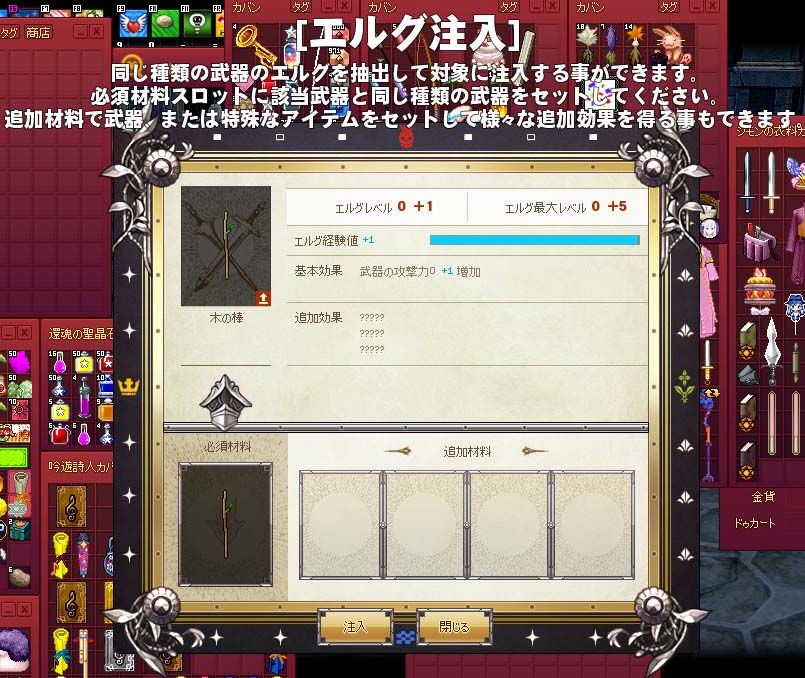 耐久力が0だと使用できません…採集用ナイフや練習用木刀はエルグ注入できませんでした(´・ω・`)
