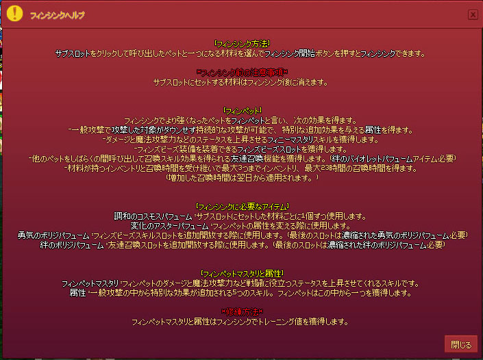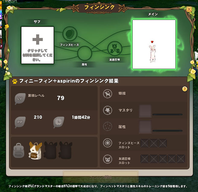 フィニーフィンのインベントリを増やしたり、固有属性?を得たり、呼び出し可能時間を長くしたりできるということか……