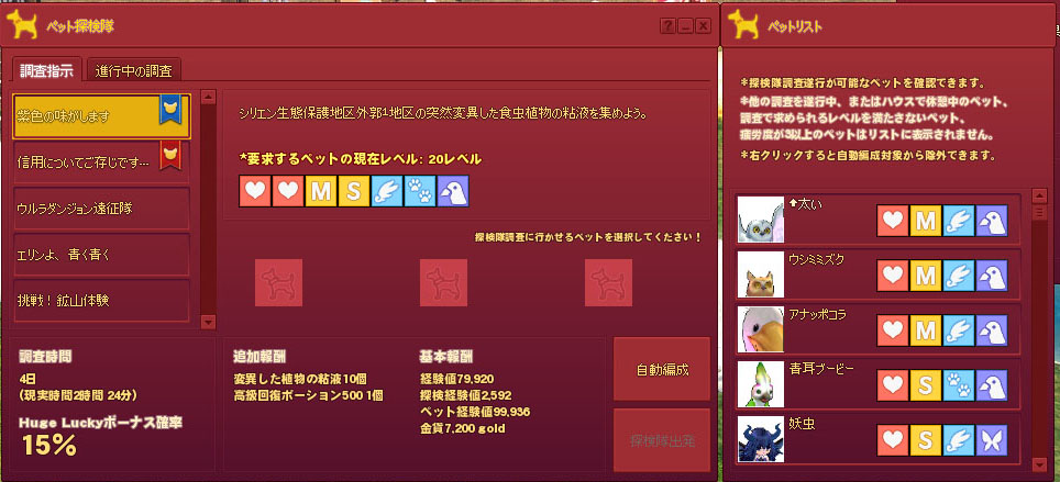 ペット探検隊調査出発時に調査時間の短縮効果が適用されます。