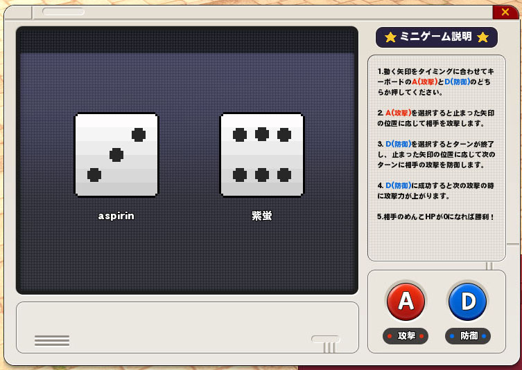 自分のターンになると左右に動く矢印が現れるので、赤いゲージのところでAかDを押します。