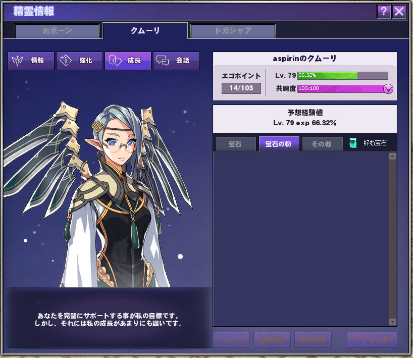不思議なオーラが宿った精霊石(300%)は精霊武器の「成長」タブにはありません。