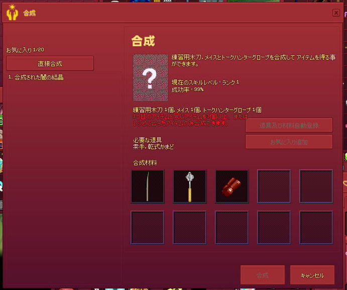 魔力の結晶、不安定な闇の結晶、ダークオイル、岩の結晶からなる「合成された闇の結晶」というレシピをお気に入りに追加しておけば、あとはレシピ名をクリックするだけで自動セットされます。