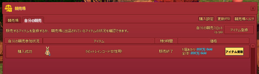 呪いのうさろーぶを競売場で落札しましょう 2023年05月02日 13:01 カテゴリ:マビノギ仕様 4Tweet 競売場で「呪いのうさろーぶ」ことラビットレインコートの出品を確認! 今回はこれを購入してみましょう。ふむふむ200万Goldで…… アイテムを購入しました。自分の競売参加状況で受け取ってください。あら(´・∀・`)これで購入したことになるんですね!!てっきり直後に201万で入札されて競り上がっていくものかとwww「自分の競売」タブで確認!!呪いのうさろーぶをゲット!ヽ ・∀・ ノ ヤター!出品されたアイテムとゴールドさえあれば簡単に手に入れられますね!……まぁ肝心の品物がなければ入手できないんですがね…… タグ :#売買#仕様#アイテム#衣服 「マビノギ」の最新記事 「仕様」の最新記事 この記事へのコメント コメント一覧 (4) 1. とうかっち 2023年05月02日 14:26 ぼくは既に入手済みでっす!ブーツも! あとは染めるだけ! 0 あすさん がしました 2. あすさん 2023年05月03日 00:39 >>1 >とうかっちさん ヽ ・∀・ ノ ヤター! ∩(´・ω・`)つ―*'``*:.。. .。.:*・゜゚・* ピンクにでもな~れ 0 あすさん がしました 3. とうかっち 2023年05月03日 04:09 >>2 例の箱からダイレクトが手に入ったので染めたよ! 0 あすさん がしました 4. あすさん 2023年05月03日 13:51 >>3 (*∩∀∩*)ワクワク♪ 0 あすさん がしました コメントフォーム 名前 コメント 記事の評価 リセット リセット 顔 星 情報を記憶 コメントを投稿する