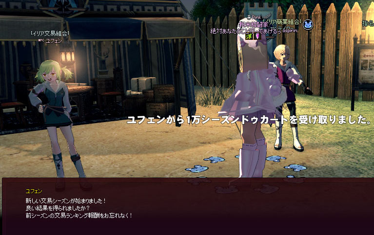 シーズンの初期化を待ってからペット探検隊を完了するとお得 2023年11月01日 13:12 カテゴリ:マビノギ交易 2Tweet 少額ながらペット探検隊の追加報酬には…シーズンドゥカートをもらえるものがあるので、これを交易の軍資金とすることにしましょう。まず新しいシーズンが始まったら交易所のサポーター、交易組合に話しかけて初期化を行います。 それまで持っていたシーズンドゥカートがドゥカートに換金されてしまうところがポイント。なので交易シーズンが初期化されてからさっきのペット探検隊を完了すると…… 誰のための配送なのか地域の名物初期化の際にもらえる1万シーズンドゥカートに追加されました(^o^)ノ イエー!本当にささいなことですがwwwww交易シーズンの切り替わりにはちょっとした工夫ができるというわけです。 タグ :#交易#仕様#ペット探検隊#ネタ 「マビノギ」の最新記事 「交易」の最新記事 この記事へのコメント コメント一覧 (2) 1. とうかっち 2023年11月01日 14:54 初動がかなり変わるのででかいと思うです 0 あすさん がしました 2. あすさん 2023年11月01日 16:15 >>1 >とうかっちさん たしかに1万と2万では買える量が大違いですね…! 0 あすさん がしました コメントフォーム 名前 コメント 記事の評価 リセット リセット 顔 星 情報を記憶 コメントを投稿する