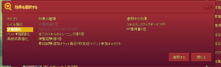レベル、才能、ペット/戦闘、高級成長の4カテゴリから任意の効果を