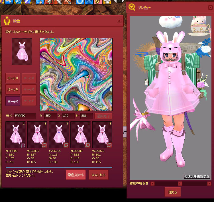 染色アンプルPro30個でも足りなかった 2026年01月06日 12:32 カテゴリ:マビノギ商売 Tweet マネキン用の「呪いのうさろーぶ」ことラビットレインコートをProの染色でピンクにします。カラーコードを入力すると、必ず1番にセットされるので「コントロール幻想」の入り込む余地がありません。1/5の確率です。 結局30個使ってもFAAADDにならなかったのでダイレクト染色アンプルを使うwwwwwwR: 250G: 170B: 221ほおお!!!!!ジャイアントが着るとこんな感じになるんだ!選べるのは性別と身長と種族のみで、体形をシミュレートできないのが残念!!マネキンに着せて展示!農村で見られる立ちスタイルw タグ :#ネタ#売買#アイテム#衣服#足装備#確率#ダンバートン#フレンド 「マビノギ」の最新記事 「商売」の最新記事 この記事へのコメント 0 フンイキー 2021年00月00日 --:-- ID:manabinogi 私はフンイキー!ただのムードメーカーよ! コメントフォーム 名前 コメント 記事の評価 リセット リセット 顔 星 情報を記憶 コメントを投稿する