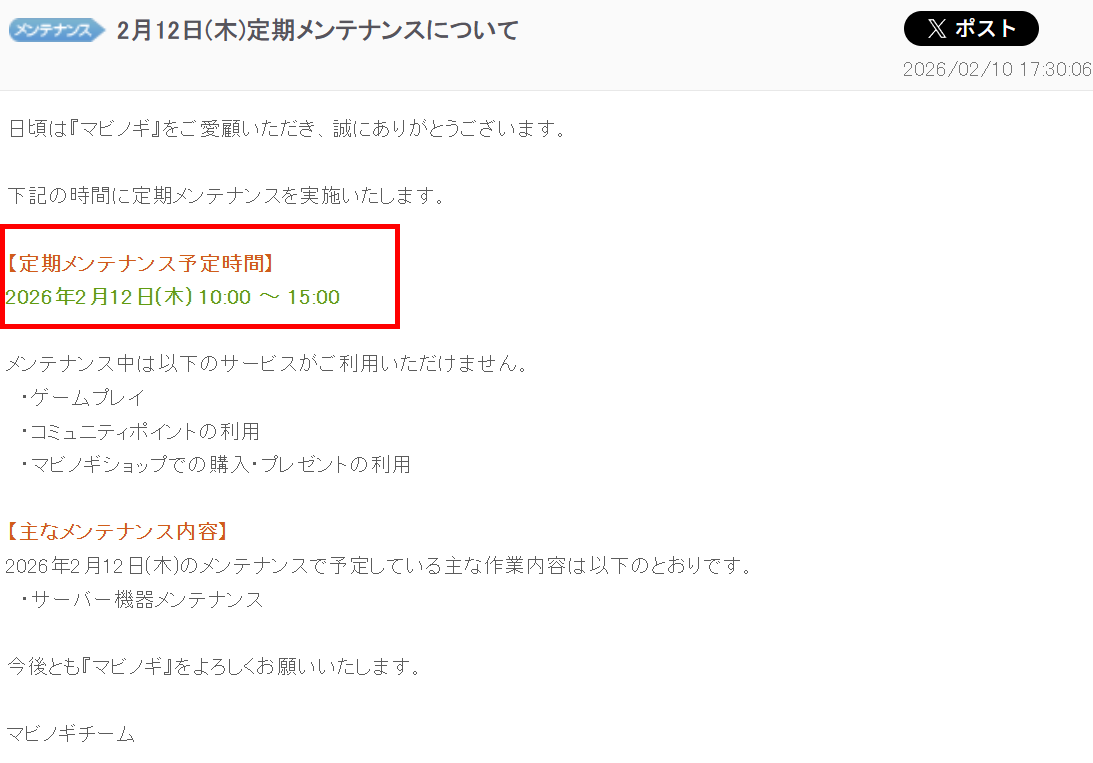 メンテはないが空輸はあります。ミレシアンの週初めは水曜日 2026年02月11日 13:35 カテゴリ:マビノギ交易 Tweet 商団や “つぶつぶ交易” の品物はメンテナンスではなく水曜日にリセットされる仕様なので、祝日で定期メンテナンスが見送られたとしても定刻通り始まります。水曜日にリアルの用事を工面している人は多いと思いますが、祝日の場合はかなり例外的な扱いとなるため注意が必要ですwww ミレシアンがマビの外で遊んでいる間、メンテはどんどん進んでゆく…… タグ :#ネタ#定期メンテナンス#交易 「マビノギ」の最新記事 「交易」の最新記事 この記事へのコメント 0 フンイキー 2021年00月00日 --:-- ID:manabinogi 私はフンイキー!ただのムードメーカーよ! コメントフォーム 名前 コメント 記事の評価 リセット リセット 顔 星 情報を記憶 コメントを投稿する