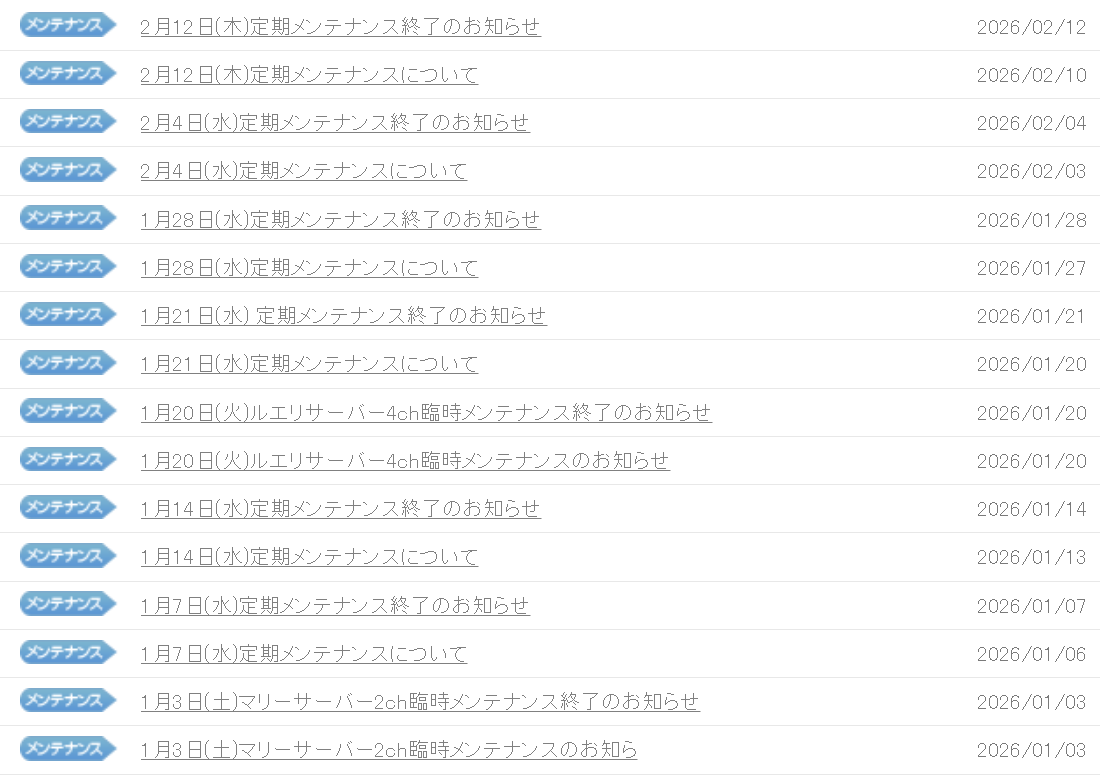 明日というか今週の定期メンテナンスは実施されないようです 2026年02月17日 12:22 カテゴリ:マビノギ運営 Tweet 先週は水曜日が祝日のため翌日に繰り越されましたが…… 今週の “定期” メンテナンスはないようです。 特定のチャンネルで臨時メンテナンスが発生することがたびたびあるので油断はできません。1月3日マリー2ch1月20日ルエリ4chときたら…次は…2月18日タルラーク8chあたりに来るかもしれないw存在しないチャンネルの臨時メンテナンスなんか怖くないよねw定期メンテナンスを毎週行わなくても平気になったなら朗報ですが、メンテナンスに回すリソースが足りていないなら目も当てられない…… タグ :#マビノギチーム#定期メンテナンス#ネタ 「マビノギ」の最新記事 「運営」の最新記事 この記事へのコメント 0 フンイキー 2021年00月00日 --:-- ID:manabinogi 私はフンイキー!ただのムードメーカーよ! コメントフォーム 名前 コメント 記事の評価 リセット リセット 顔 星 情報を記憶 コメントを投稿する