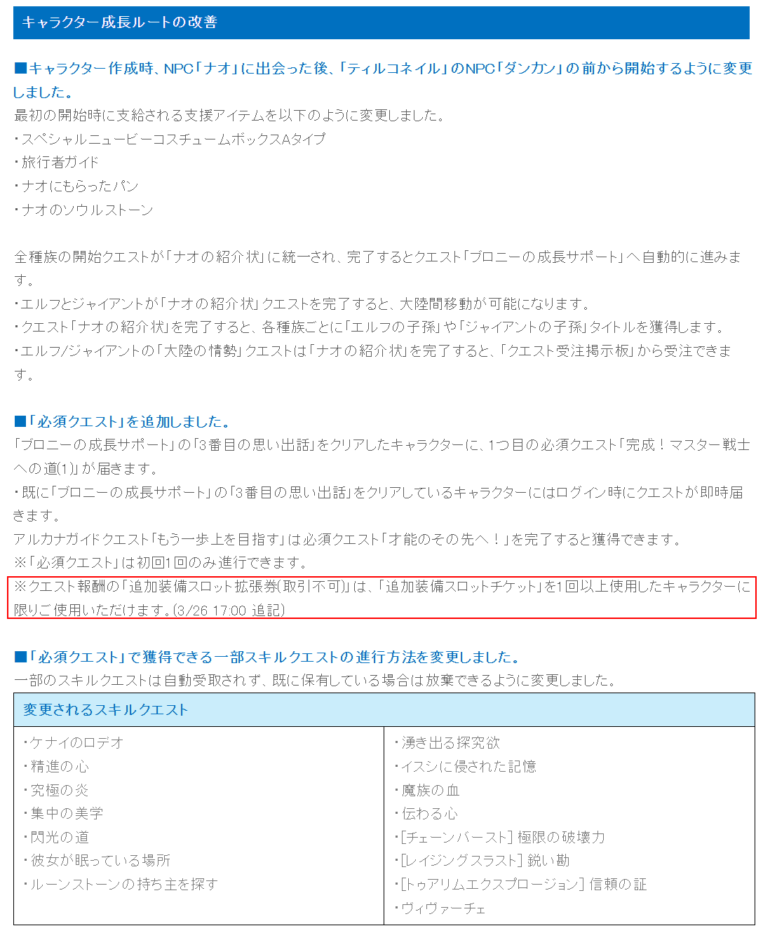 ※クエスト報酬の「追加装備スロット拡張券(取引不可)」は、「追加装備スロットチケット」を1回以上使用したキャラクターに限りご使用いただけます。(3/26 17:00 追記)